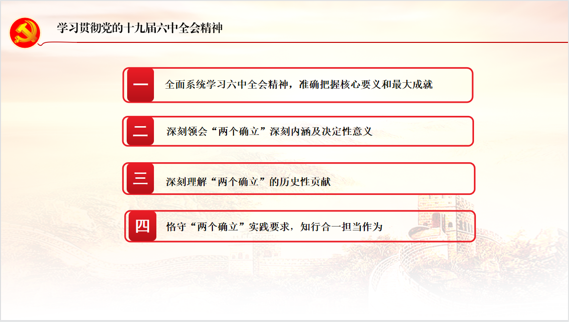 报告围绕“全面系统学习六中全会精神,深刻领会‘两个确立’深刻内涵及决定性意义,深刻理解“两个确立”的历史性贡献,恪守‘两个确立’实践要求,知行合一担当作为”四个方面展开讲授,阐述了十九届六中全会主要框架、“两个确立”的决定性意义、“两个确立”的历史性贡献、十九届六中全会公报“十个明确”等内容,用图表形式对十九届六中全会中的“十个明确”和十九大报告中的“八个明确”作了对照讲解,《决议》是在党的十九大报告“八个明确”的基础上,用“十个明确”对习近平新时代中国特色社会主义思想的核心内容作了进一步概括,丰富和发展了习近平新时代中国特色社会主义思想的核心内容。