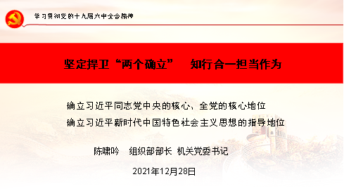 12月28日下午,机关党委举办学习贯彻党的十九届六中全会精神专题辅导报告会。机关党委全体党员参加会议,党委组织部部长、机关党委书记陈啸吟作《坚定捍卫“两个确立” 知行合一担当作为》专题辅导报告。