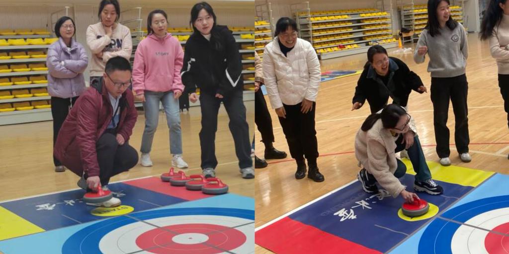 比赛以团队和个人的形式进行,在体育学院裁判的培训和指导下,各团队进行赛前热身和准备,大家都参与其中,体验冰壶赛事乐趣比赛现场,当队友们打出好的成绩,大家欢呼声一片。旁观的队员们,一边叫好助威,一边观摩学习,时而又被场上的各种意外逗乐。赛场上,队员们凝神聚力一掷,有的队员精准投入了得分区,有的队员意外把对手的冰壶推入了得分区。队员们轮番上阵,加油鼓劲声此起彼伏,欢声笑语响彻全场。