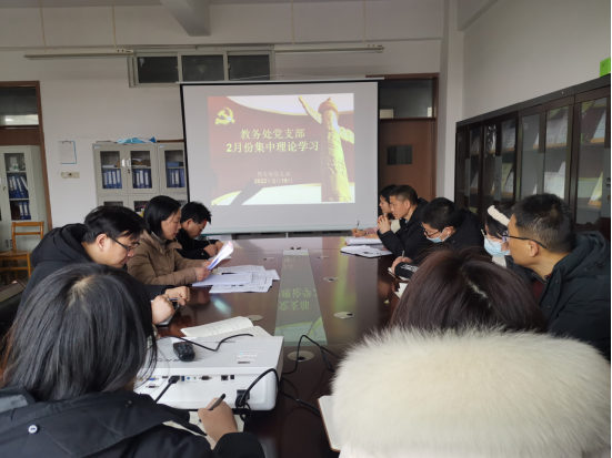 2022年2月19日上午,教务处党支部在逸夫楼A202召开2月份政治理论学习会暨新学期工作会议。教务处全体成员参会,会议由党支部书记王红艳主持。