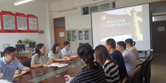 6月17日上午,教务处党支部在逸夫教学楼A202会议室召开六月份集中政治理论学习会,教务处全体党员参加,会议由教务处党支部书记王红艳主持。