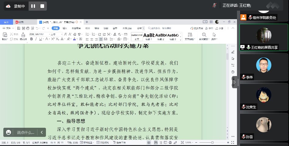 7月29日上午,教务处召开了“三维比对、精准争创、奋力向前”争先创优活动交流研讨会。会议采用线上方式进行,由党支部书记王红艳主持,教务处全体人员参会。