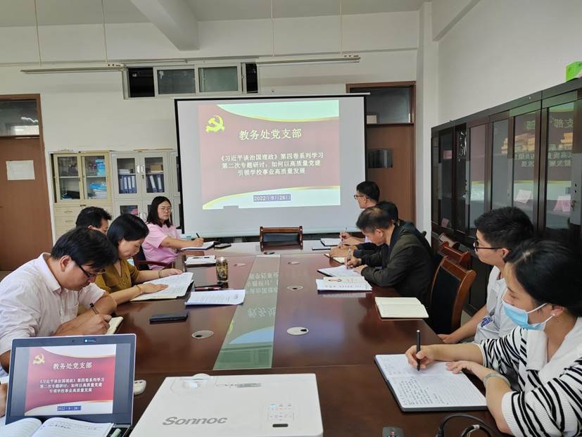 9月26日下午,教务处党支部在逸夫楼A202开展《习近平谈治国理政》第四卷系列学习第二次专题研讨:如何以高质量党建引领学校事业高质量发展。会议由党支部书记王红艳主持,教务处全体党员参会。