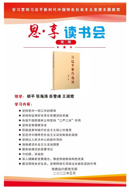 思·享读书会开始,副部长王淑霞领学《守纪律,讲规矩》《深人理解新发展理念,推进供给侧结构性改革》《建设网络良好生态,发挥网络引导舆论反映民意的作用》。支部党员胡平领读了《坚持党对一切工作的领导》《坚持和运用好毛泽东思想活的灵魂》《各级干部都要树立和发扬“三严三实”作风》;支部委员张海涛领读了《坚持总体国家安全》《积极培育和践行社会主义核心价值观》《坚定对中国特色社会主义政治制度的自信》、支部委员岳雪峰领读了《坚持以人民为中心的创作导向》《加快建设社会主义法治国家》《做焦裕禄式的县委书记》等篇目。